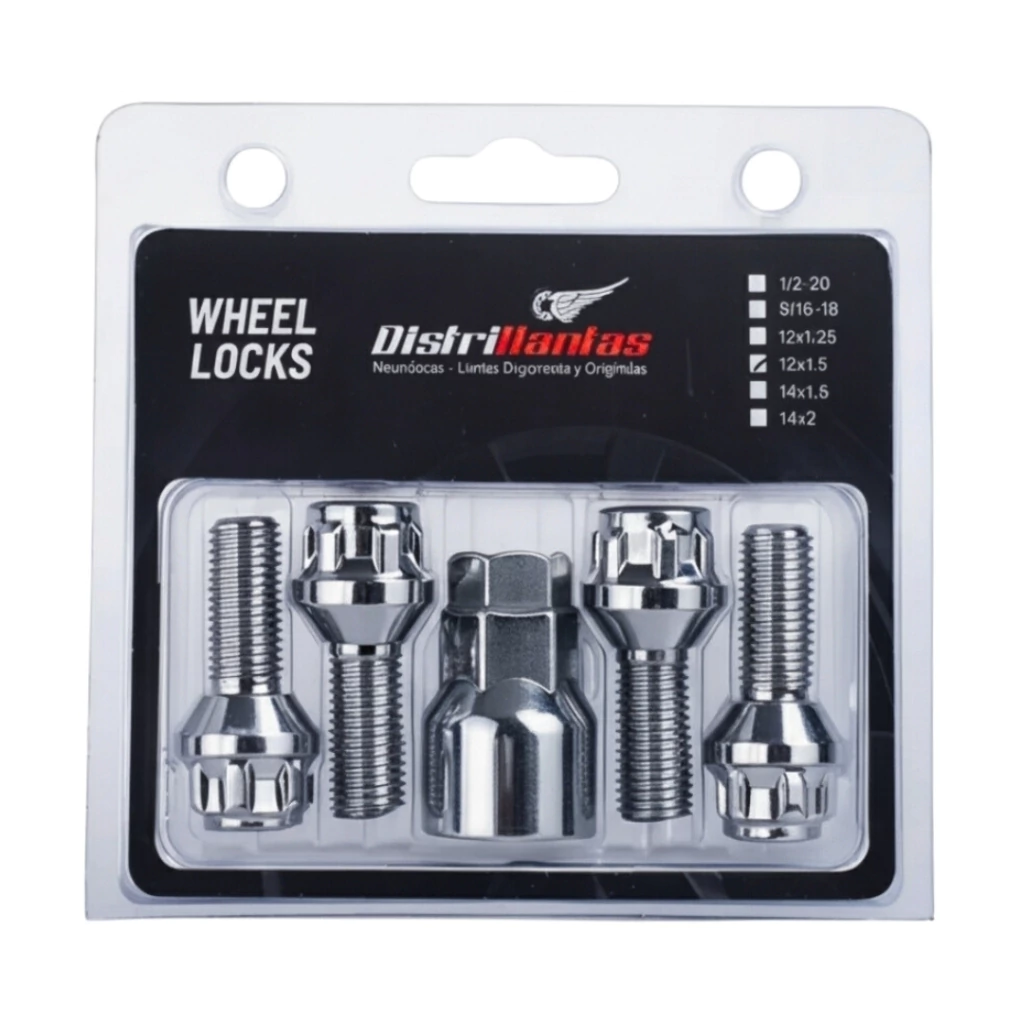 Protegé tus llantas con el bulón antirrobo Distrillantas 54705, diseñado para vehículos Volkswagen, Audi, Seat y Skoda que utilizan rosca 12x1.50 con llantas de aleación originales. Su construcción de alta resistencia, doble llave codificada y patrón exclusivo de seguridad impiden la extracción sin la herramienta original, ofreciendo protección premium en uso urbano y en viajes.